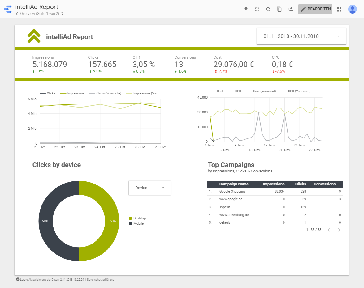 With the intelliAd Google Data Studio Connector you can quickly access your intelliAd performance data and easily create reports in Google Data Studio. Once authorized, your data is always up-to-date and available in Google Data Studio. And all that without any additional costs.